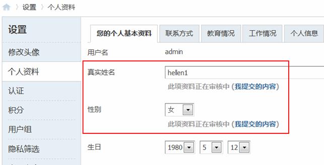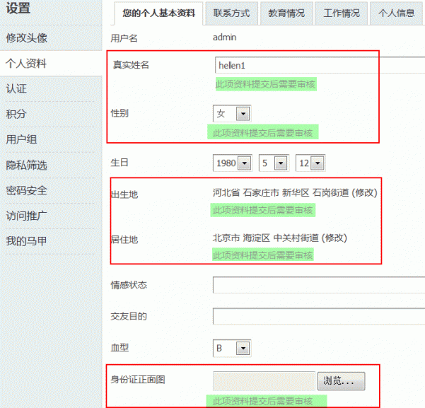 在用户栏目中开启的所有资料都可以让管理员进行审核通过后显示,会员填写的信息不合格都可以拒绝通过,可以更加充分的验证站内会员信息的真实性和准确性。