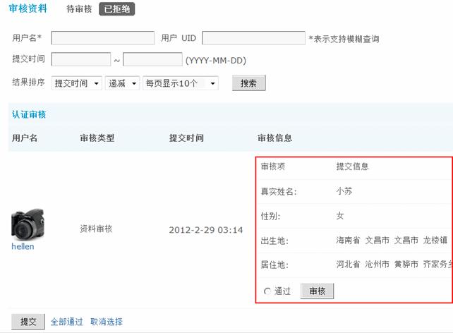 可以通过搜索用户名、用户UID、提交时间、结果排序搜索符合条件的会员信息进行审核。