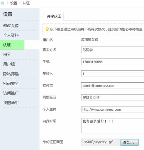 一方面可以将高质量的商家推荐给用户,另一方面也可以做为网站的增值服务。再比如,网站中有一个交友征婚版块。交友征婚是一个严肃性的话题,终生大事必须实名制啊,用户一般都需要征婚信息的可靠度。这时我们就需要实名认证功能,来验证用户的真实信息并留底,提高征婚信息的可靠度与严肃性。