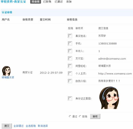 用户提交认证信息后,用户的认证信息就自动进入后台设置的【商家认证】待审核列表中,等待管理员对认证信息进行审核。