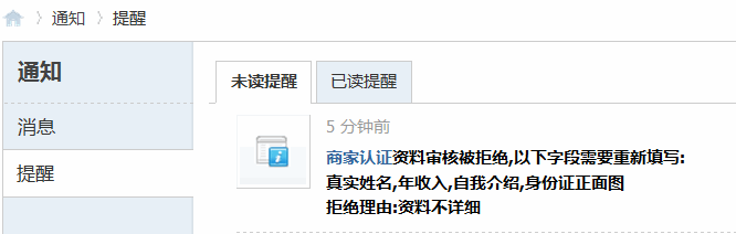 管理员在后台审核认证信息时,所做的通过、拒绝等操作,系统都会给用户发送通知。这样用户在前台的提醒中就可以收到相关的通知。如果用户的认证申请被拒绝,通知中就会说明具体是哪项信息不符合要求。用户可以再次完善认证信息并提交认证信息,再次等待管理员的审核。