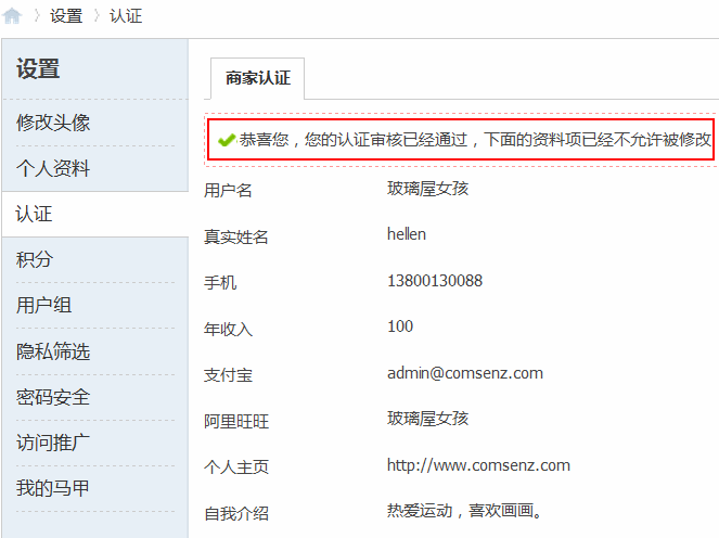 当管理员审核并通过用户认证后,用户会在前台收到通过的通知,通过审核后用户不能在对认证的信息进行修改。见下图