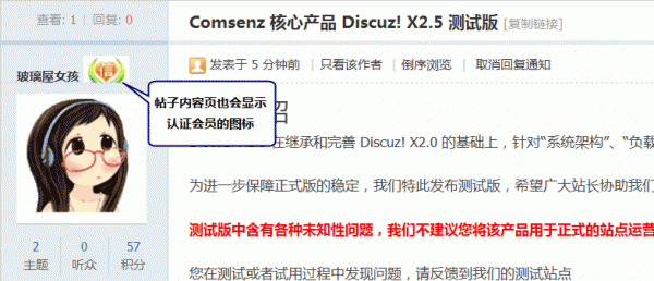 在版块的帖子列表页面,如果是认证用户发布的帖子,会在用户名称后显示认证图标,见下图