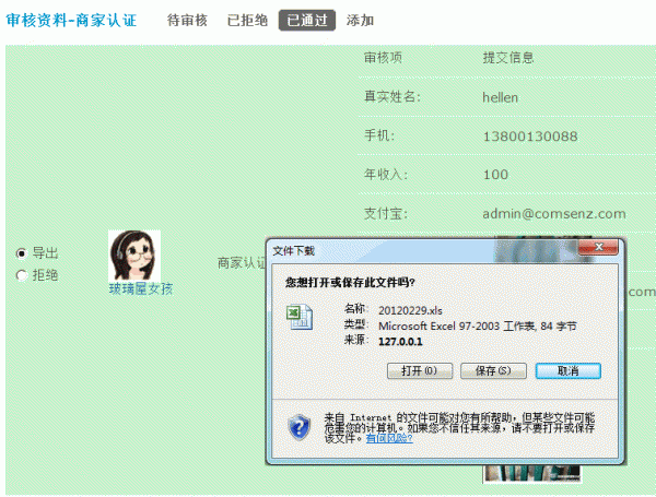 当有用户提交了商家认证的信息后,管理员可以登录后台,对认证信息进行管理操作。