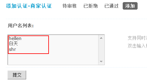 除了会员申请外,我们还新增了管理员手动添加用户认证信息的功能,直接在用户名列表输入用户名即可,支持同时添加多个用户,一行一个用户