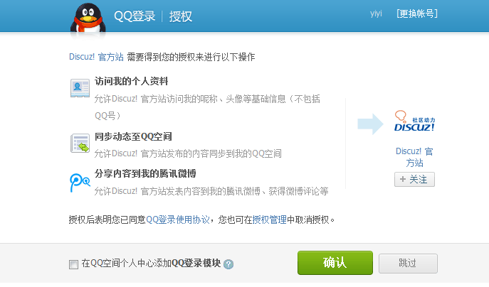 输入QQ号码(IE下可自动识别当前登录QQ)、密码,点击登录,成功登录后,用户可自行选择向网站授权的操作项目: