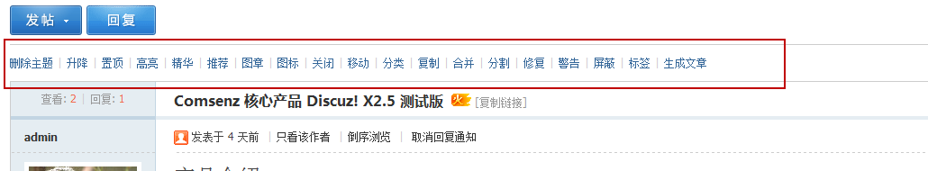 在主题的内容页,根据需求可以对该主题进行删除、升降(将主题提升至顶部或下降至底部一次,但不固定在此)、置顶、高亮、精华、推荐、图章、图标、关闭、移动、分类、复制、合并(将本主题合并到目标主题下)、分割(将某楼层生成一个新主题)、修复、警告(被警告一定次数后的用户将被自动禁止发言 30 天,之前所发内容也将被自动屏蔽)、屏蔽、标签、生成文章以及推送(将主题推送到门户下的模块)的操作