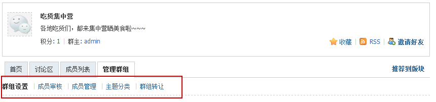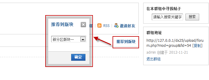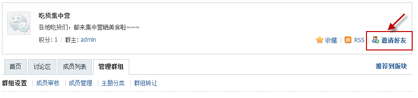 推荐到版块:将群组推荐到论坛的版块,将会以推荐群组显示到主题列表区域上方