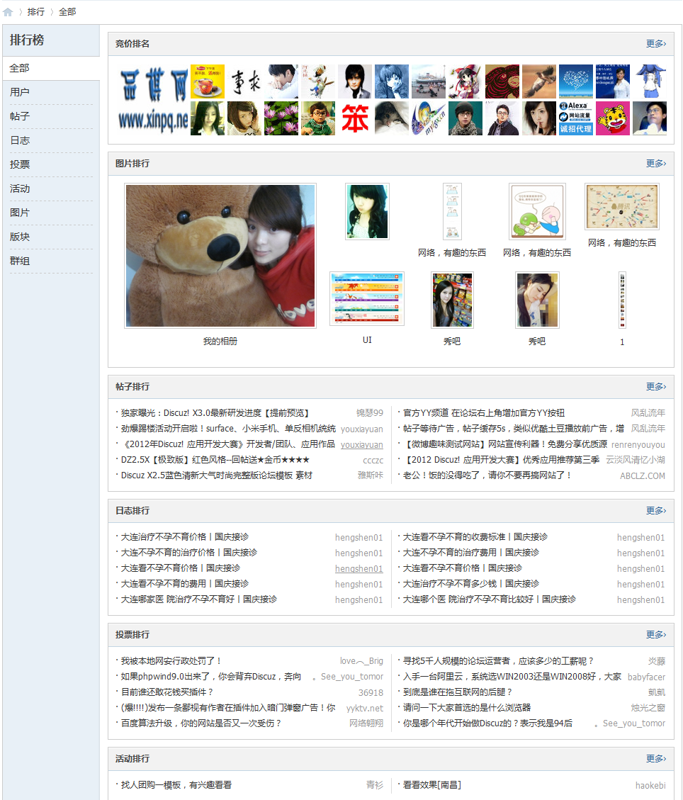 用户排行能够增强会员积极性,引导用户消费积分。在排行榜 => 用户排行列表中,分列竞价排行、美女排行、帅哥排行、积分排行、好友数排行、发帖数排行与日志数排行,能调动会员的积极性。站长可以引导会员获取积分、主动发帖,争取上榜,也可以鼓励会员消费积分加入竞价排名