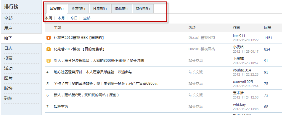 一个社区可能拥有大量的注册会员,但活跃会员可能只占有小部分比例,而这部分活跃用户却是社区主要内容的产生者与互动者,是社区的精华用户。排行榜功能帮助社区拥有更多的活跃用户,就意味着使社区更有活力。