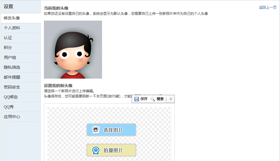 使用默认头像,无法彰显自己的个性,用户可以自己上传一张新照片来作为自己的个人头像,系统提供了 “选择图片”或是“拍摄图片“两种上传方式,选择文件后,缩放切割所需的区域,保存即可