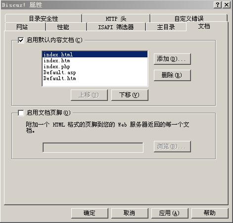 单击“文档”页签,在默认内容文档中添加 index.htm、index.html、index.php 三个文件,并将所有默认文档排序,顺序按照下图所示。完成后,单击“确定”,关闭站点属性配置窗口,回到 IIS 管理器主界面。