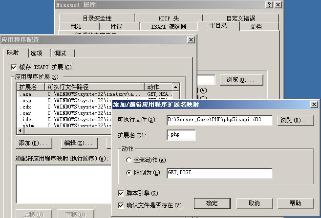 在站点属性窗口中,单击“主目录”页签,单击“配置”按钮,在新弹出的“应用程序配置”对话框中,单击“添加”按钮,加入 PHP 的 ISAPI 支持,选择可执行文件:X:\Server_Core\PHP\php5isapi.dll、扩展名为 .php、限制动作为:GET,POST。单击“确定”添加,并在“应用程序配置”窗口中查看 .php 扩展是否加载成功。若成功,则单击“确定”关闭配置窗口,回到站点属性主窗口。