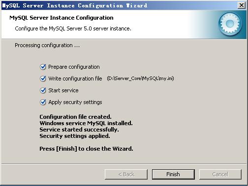 待文件复制安装完毕后,进行 MySQL 设置界面,单击 Finish。