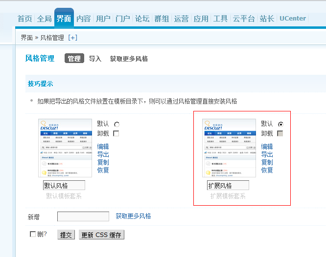 Discuz! X 程序读取模板的流程为, 先读取当前模板套系目录下的模板文件, 如 yourstyle 文件夹下 common/header.htm 文件, 如果没有这个文件, 则自动读取默认风格 /tempalte/default 目录下的 common/header.htm 文件。这里需要提醒一下, 扩展的风格不再需要原来的 CSS 文件, 只需要新建一个以 extend_ 为前缀加源文件名的扩展 CSS 文件即可, 例如:extend_common.css 文件、extend_module.css。扩展的 CSS 文件只需要加入扩展的 CSS 代码即可!这扩展代码将在生成缓存时, 自动追加到模板缓存文件中。